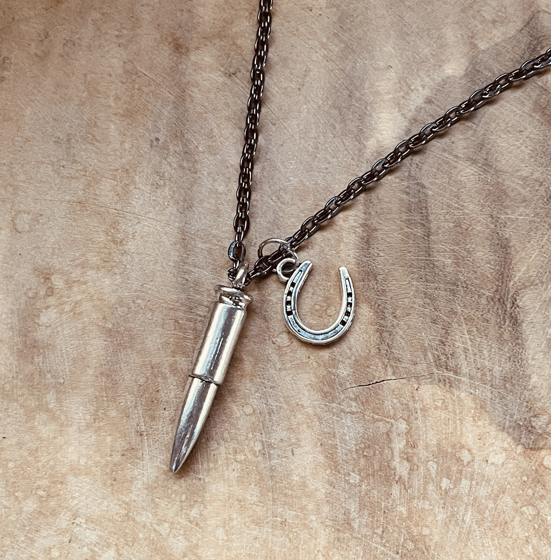 Make a bold statement with this bullet necklace, designed for free spirits, collectors, and everyday storytellers. This piece features a bullet pendant paired with a carefully chosen charm that complements its rugged, meaningful style — each necklace is thoughtfully assembled so no two feel exactly the same.