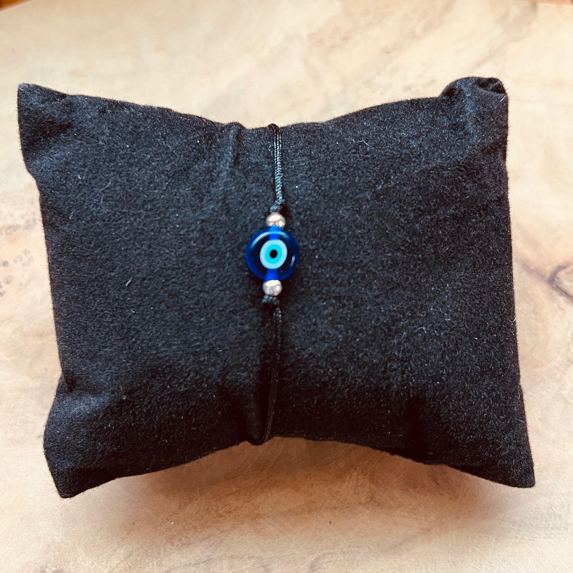 • Center bead: deep blue glass evil eye (approx. 8mm)