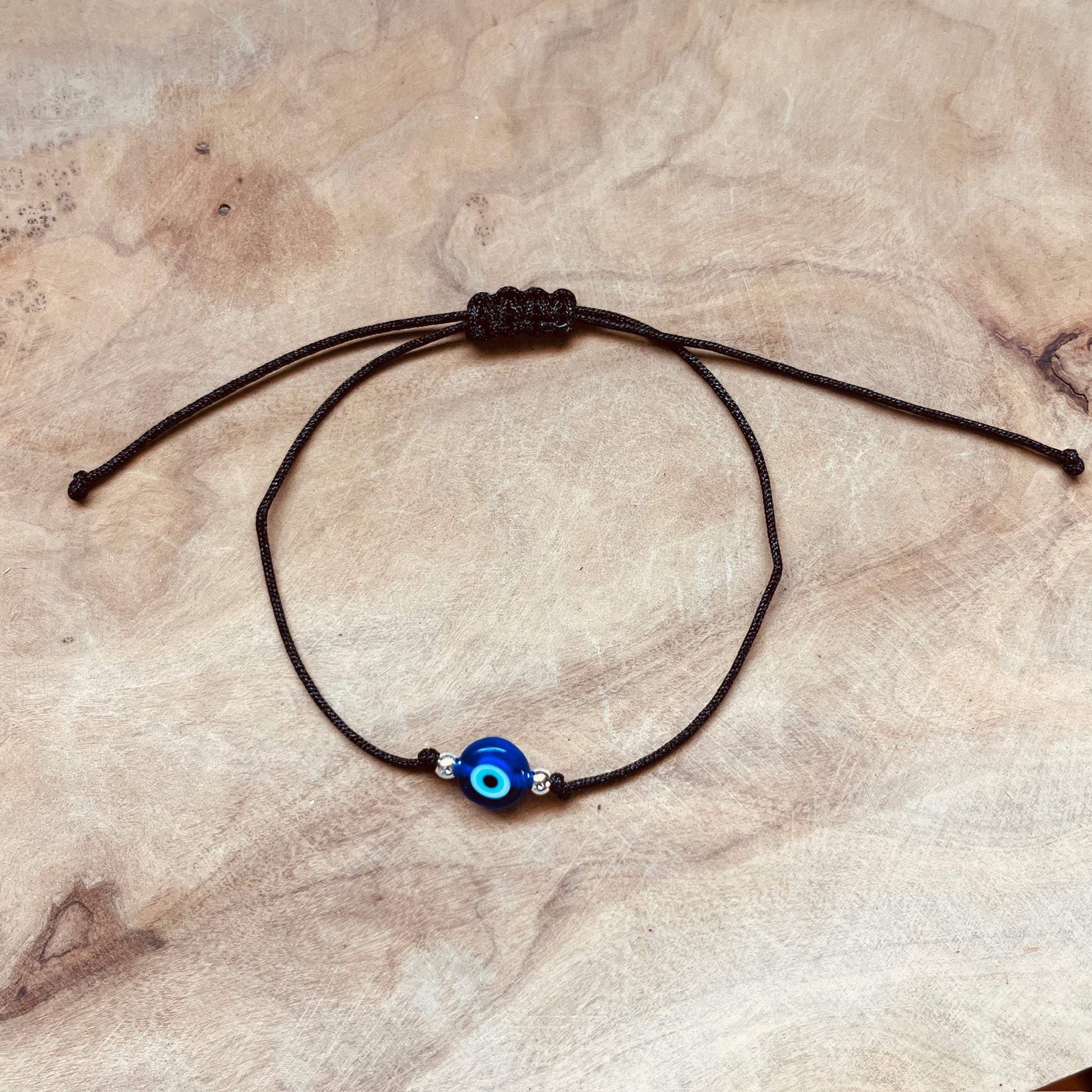 Handcrafted with a vibrant blue glass evil eye bead on a sleek black adjustable cord, this piece blends simplicity and symbolism — perfect for everyday wear or layering with other bracelets.