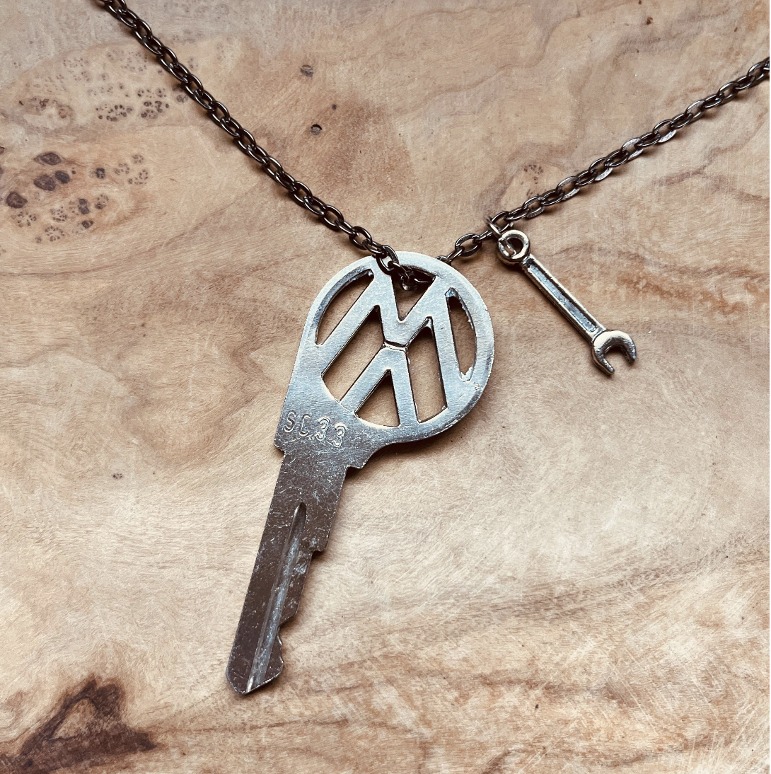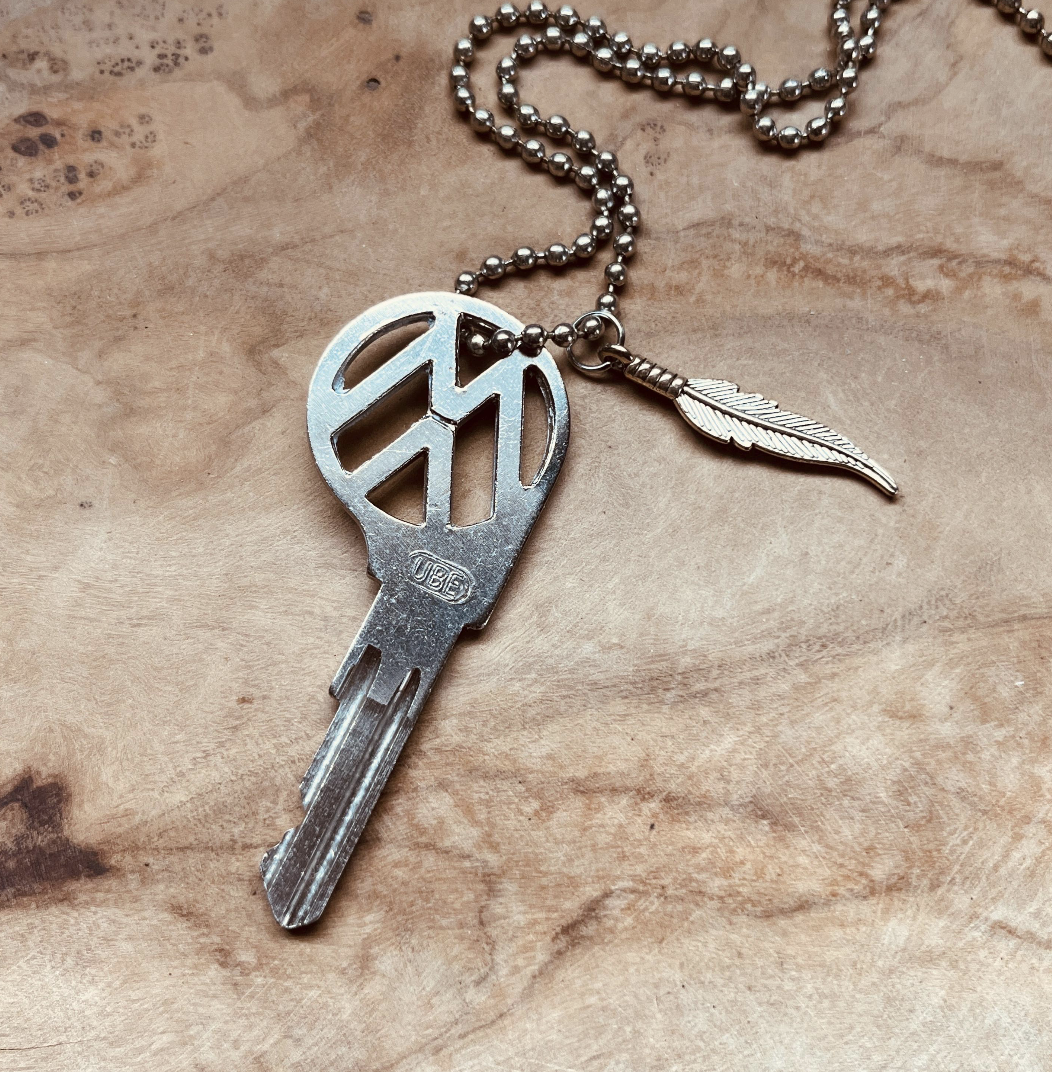 This piece is made from an authentic vintage Volkswagen key that has been carefully upcycled into a unique necklace or keychain. Each key carries its own history, now transformed into a wearable keepsake with a bold VW cutout design.