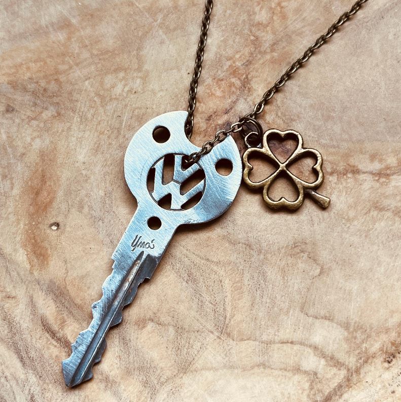 This piece is made from an authentic vintage Volkswagen key that has been carefully upcycled into a unique necklace or keychain. Each key carries its own history, now transformed into a wearable keepsake with a bold VW cutout design.